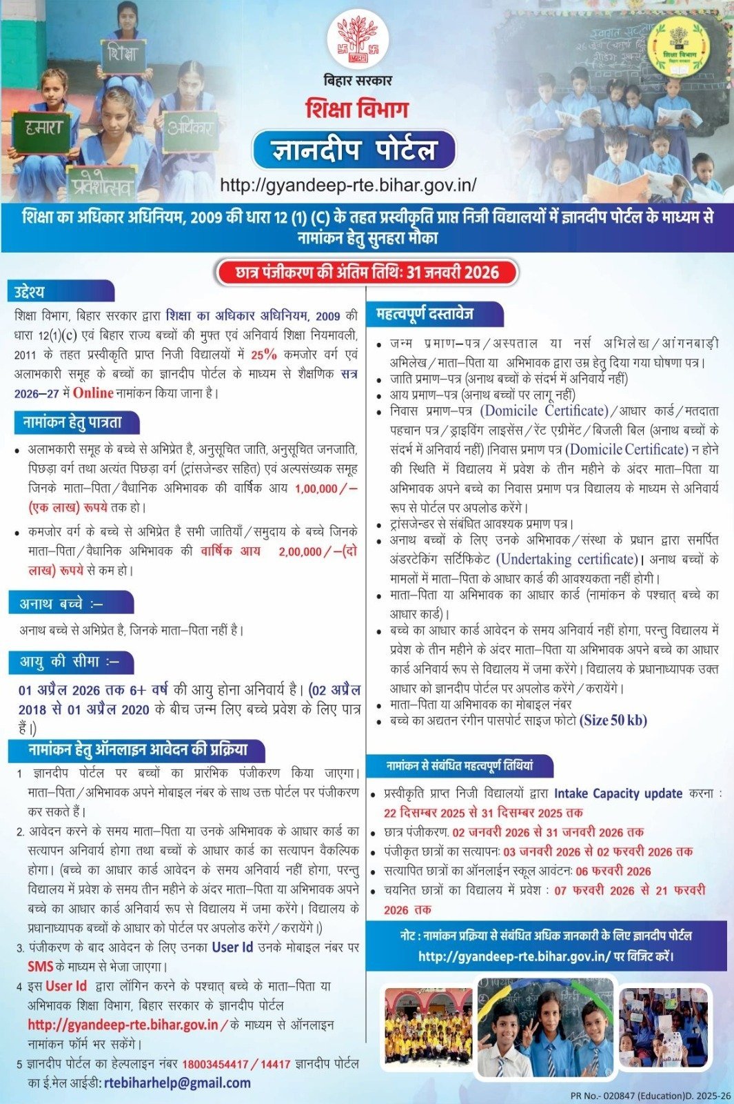 बिहार सरकार ने राज्य के गरीब और आर्थिक रूप से कमजोर बच्चों के लिए एक बेहतरीन पहल की है। शिक्षा विभाग, बिहार के तहत ज्ञानदीप पोर्टल (Gyandeepportal) की शुरुआत की गई है, जिसके माध्यम से राइट टू एजुकेशन (RTE) एक्ट 2009 के प्रावधानों को लागू किया जाएगा। इसके तहत, प्राइवेट स्कूलों में 25% सीटों पर आर्थिक रूप से कमजोर वर्ग (EWS) और वंचित समूह के बच्चों का बिल्कुल मुफ्त (Free of Cost) एडमिशन कराया जाएगा। अगर आपके घर में 6 वर्ष पूरे कर चुका कोई बच्चा है और आर्थिक तंगी के कारण आप उसे प्राइवेट स्कूल में नहीं पढ़ा पा रहे हैं, तो यह स्कीम आपके लिए है। ऑनलाइन आवेदन की प्रक्रिया 2 जनवरी से शुरू हो चुकी है और अंतिम तिथि 31 जनवरी 2026 है। यहाँ पूरी प्रक्रिया, पात्रता और स्टेप-बाय-स्टेप आवेदन गाइड दी गई है।